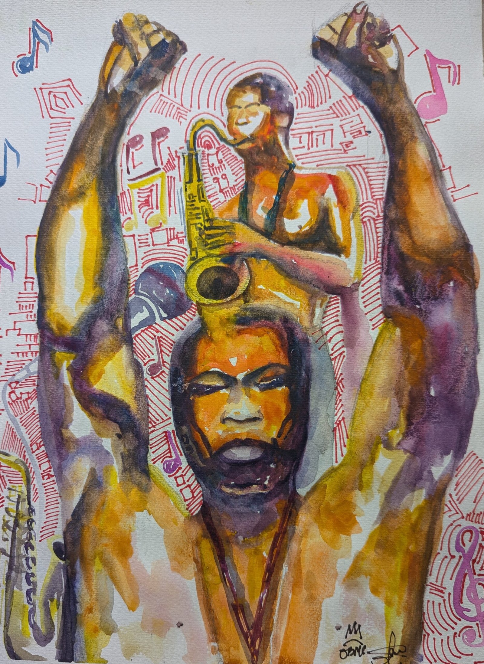 *Anikulapo*, an evocative watercolor painting on A3-sized paper measuring 11.7 by 16.5 inches, serves as a vibrant homage to Afrobeat legend Fela Aníkúlápó Kútì, whose name and spirit permeate the artwork. The title, meaning “one who carries death in their pouch,” reflects Fela’s defiant stance against oppression, a theme woven into the composition with bold strokes and fluid watercolor hues. Created on a canvas that balances intimacy and impact, the piece captures the essence of his revolutionary legacy through a dynamic interplay of color and form. The central figure, painted in rich ochre, yellow, and purple tones, stands with raised arms in a triumphant pose, symbolizing Fela’s unyielding resistance to Nigeria’s military regimes. The face, serene yet resolute with closed eyes, mirrors his inner strength amid adversity, a nod to his survival of brutal raids like the 1977 attack on Kalakuta Republic. Rising from the figure’s head, a second character plays a saxophone—Fela’s instrument of choice—rendered in vivid yellow, its curves echoing the rhythms of Afrobeat. Musical notes and abstract red and blue patterns swirl across the background, representing his fusion of Yoruba music with jazz and funk, and his anthems like “Zombie” and “Sorrow Tears and Blood.” The background features intricate red and pink geometric designs, reminiscent of African textiles, grounding the work in cultural heritage. These patterns, blended with watercolor’s translucent flow, evoke the communal spirit of the Kalakuta Republic and Fela’s 27-wife marriage ceremony of 1978, blending tradition with personal rebellion. The A3 format allows every detail—subtle gradients on the figures, the lively background—to shine, inviting viewers into Fela’s world of protest and pride. The color palette, dominated by warm ochre and yellow with cooler purple accents, reflects the energy of his music and the fire of his activism. The fluidity of watercolor mirrors the transient yet enduring nature of his legacy, carried forward by sons Femi and Seun Kuti, the Felabration festival, and global tributes like *Fela!* on Broadway. This artwork captures not just Fela’s musical genius but his complex humanity—his triumphs, contradictions, and the global Afrobeat movement he birthed. Signed in the lower right, it stands as a testament to an artist honoring a legend, challenging viewers to engage with his enduring call for justice.