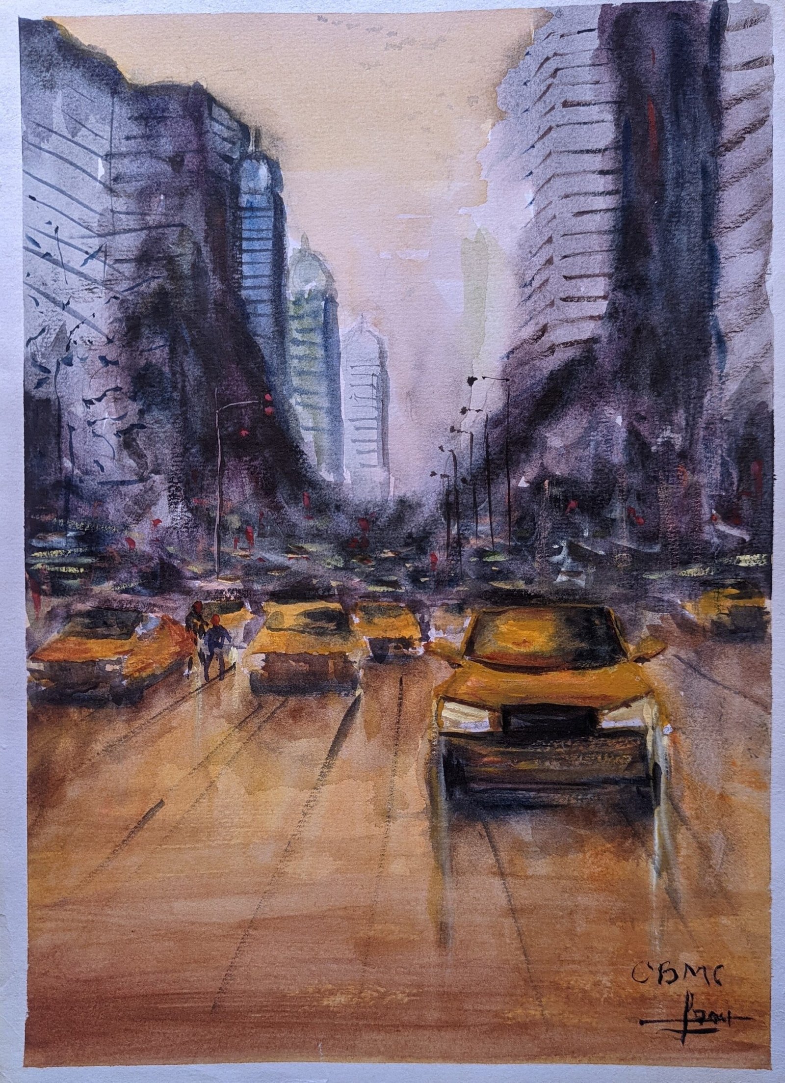This A4 watercolour painting captures the vibrant and often chaotic energy of a city street. The artist, whose signature “CBMC” and “Femi” is visible in the bottom right corner, employs a loose, impressionistic style to render the scene. The medium of watercolour is used with great skill, allowing for a sense of fluidity and movement that perfectly matches the subject matter.